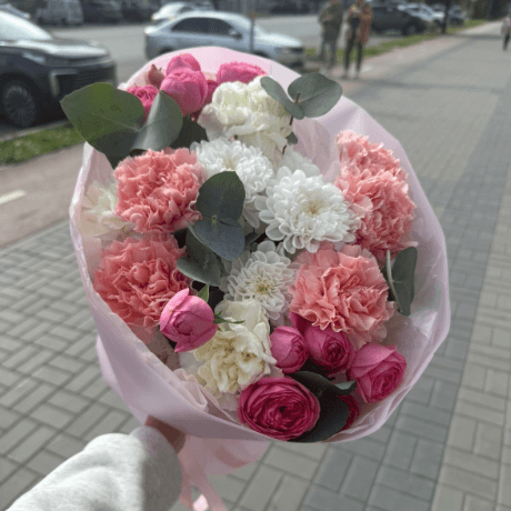 Авторская шляпная коробка из пионовидных кустовых роз, эустомы Алиса, эвкалипта, гвоздик и озотамнуса станет отличным подарком на любом мероприятии.